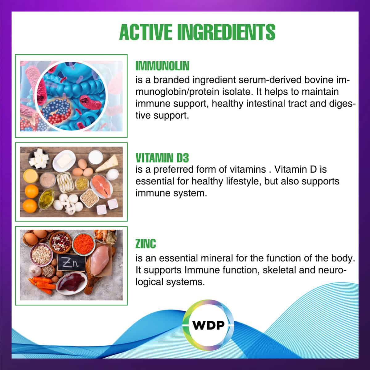Vitamin D3 (cholecalciferol): is a vitamin that facilitates the digestive absorption of calcium contained in the diet and also participates in bone formation and restoration. Vitamin D3 can modulate the innate and adaptive immune responses. Deficiency in D is associated with increased autoimmunity as well as an increased susceptibility to infection.