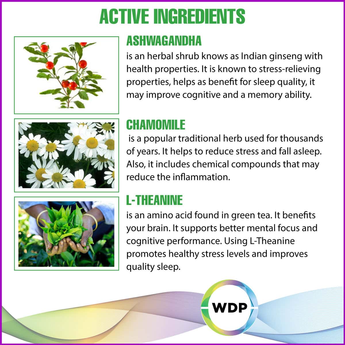 Ashwagandha Root standardized Extract Chamomile Flower Standardized extract L-Theanine |